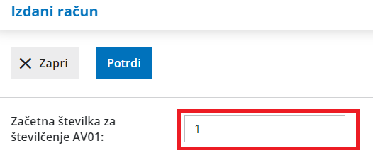 - Pri potrditvi prvega računa znotraj novega številčenja vnesemo začetno številko: