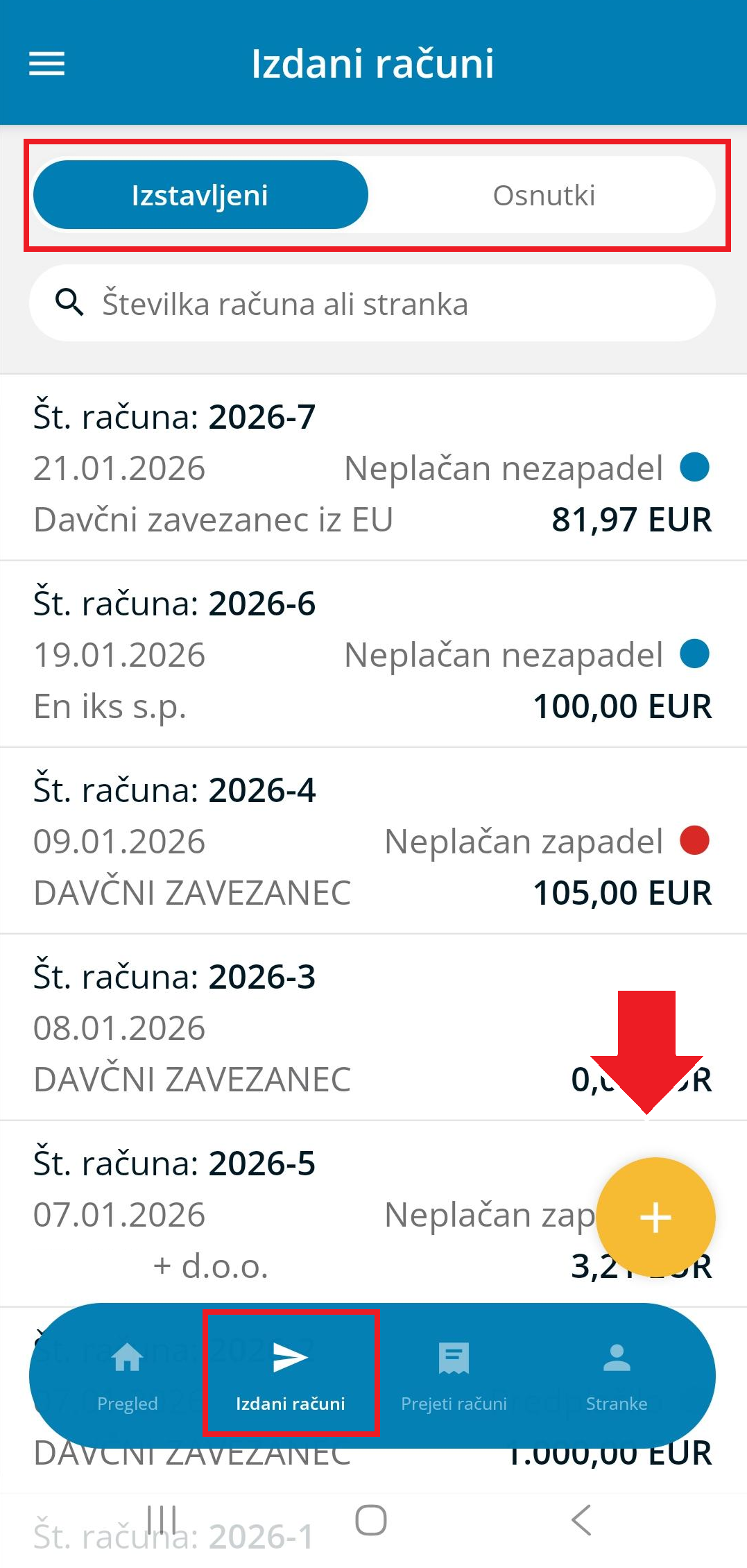 Na razdelku Izdani računi lahko pregledujemo že izdane račune in pripravljene osnutke izdanih računov.