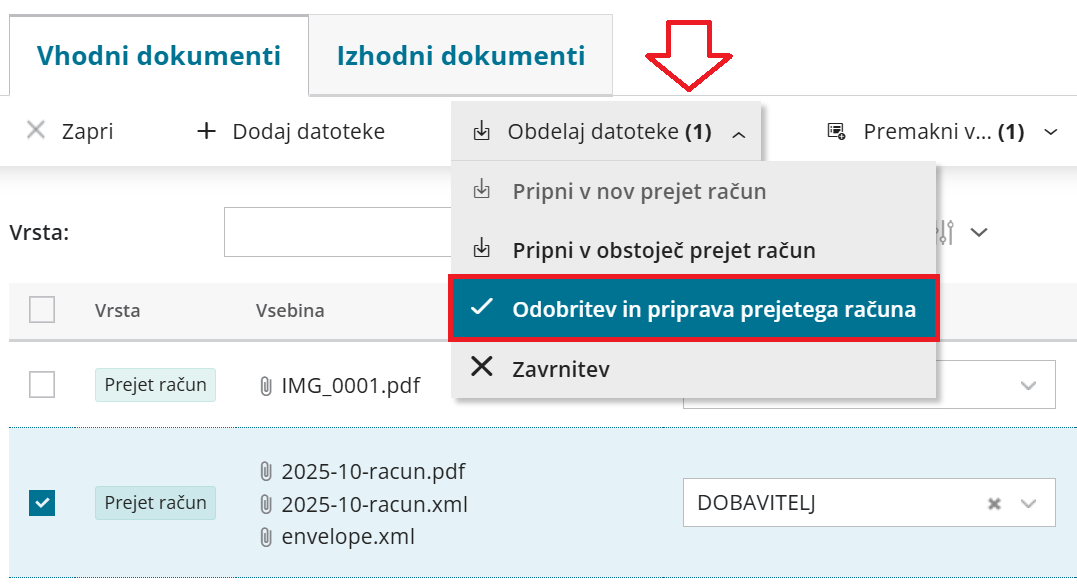 - Kliknemo na Obdelaj datoteke in izberemo Odobritev in priprava prejetega računa.