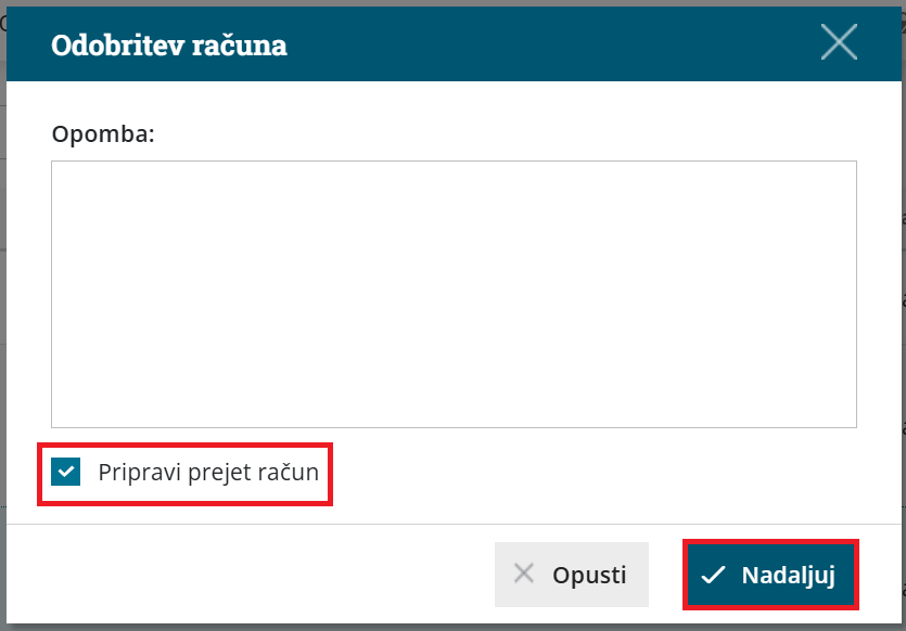 - Če polje Pripravi prejet račun pustimo prazno, program prejeti račun odobri. Dokument ostane v nabiralniku, posodobi pa se njegov status (zelena kljukica) ter se zabeleži, da je bil odobren ročno.