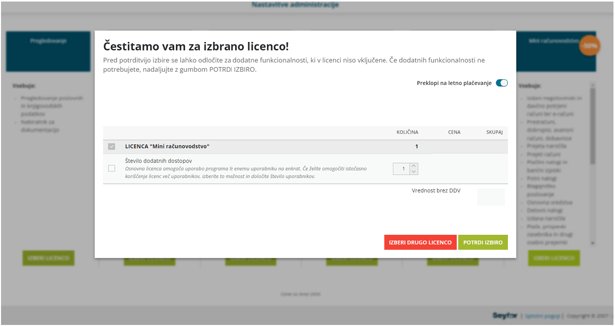 Ker ste proces naročila začeli na ceniku in že izbrali paket licenc, je na tem koraku licenca že izbrana. Ena licenca pomeni en sočasni dostop do programa.