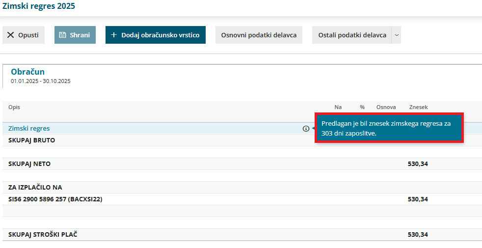 V polju Znesek regresa program samodejno predlaga z zakonom določen letni znesek zimskega regresa. Za leto 2025 je to 638,86 EUR. Če bomo zimski regres izplačali v več delih, lahko vnesemo ustrezen znesek ročno, program pa bo preostanek sam predlagal pri naslednjem obračunu.