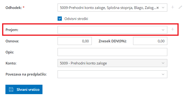 - Program samodejno določi konto 5009 - Prehodni konto zaloge.