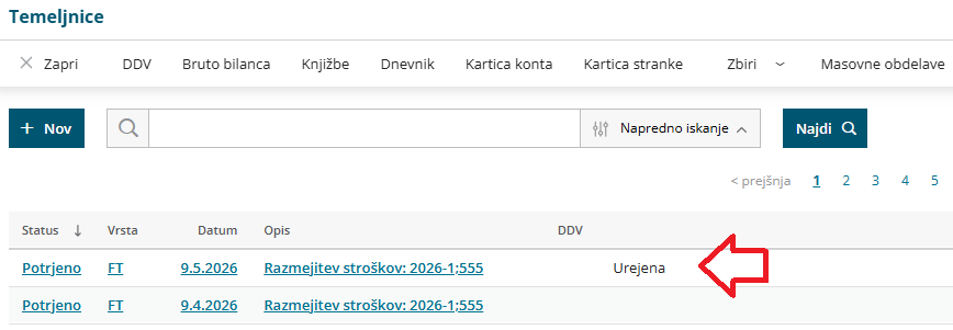 V meniju Knjigovodstvo > Dvostavno knjigovodstvo smo na preglednici temeljnic dodali zapis Urejena.