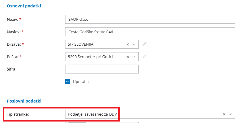 - Če želimo, da imamo pri dodajanju odhodka prejetega računa možnost izbire ustrezne stopnje DDV, izberemo v polju Tip stranke > Podjetje, zavezanec za DDV.