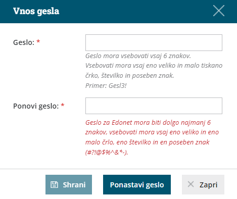 - Če smo geslo pozabili ali ga želimo samo zamenjati, kliknemo na Geslo. Vnesemo novo geslo in kliknemo na Ponastavi geslo. Na vpisan elektronski naslov bomo prejeli navodilo, kako ponastaviti geslo.