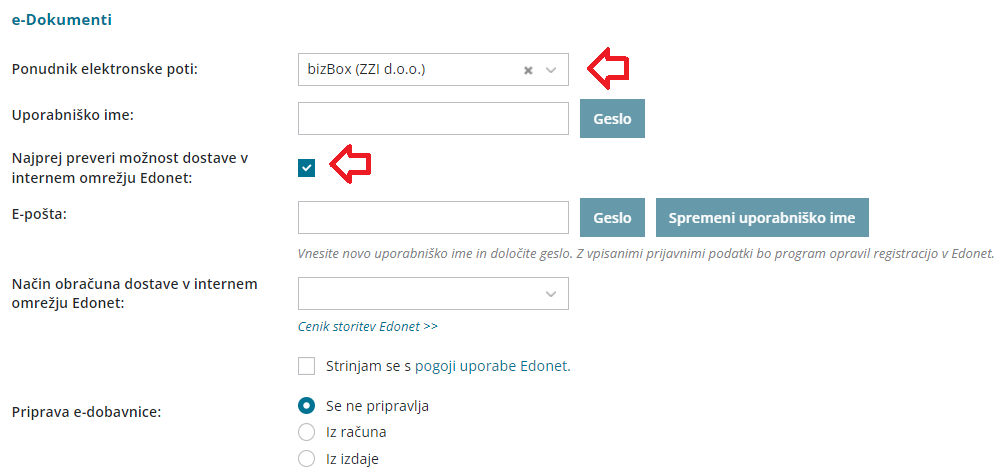 - Če imamo sklenjen uporabniški račun pri obeh ponudnikih, tako pri Edonetu kot tudi pri Bizboxu, program preveri ali je možno dostaviti e-dokument v omrežju Edonet. V kolikor to ni mogoče, ga posreduje preko omrežja Bizbox.