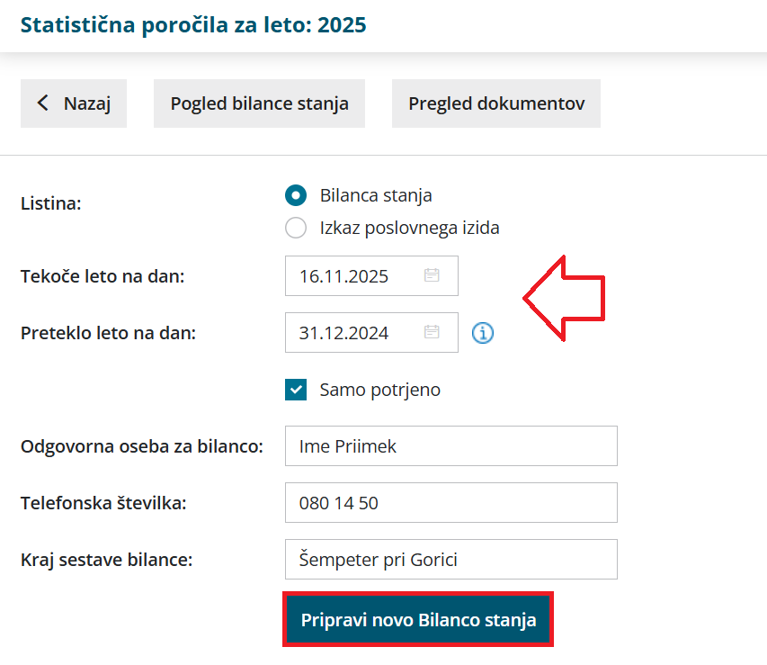 - V polje Tekoče leto na dan vnesemo datum, na katerega želimo pripraviti bilanco stanja.