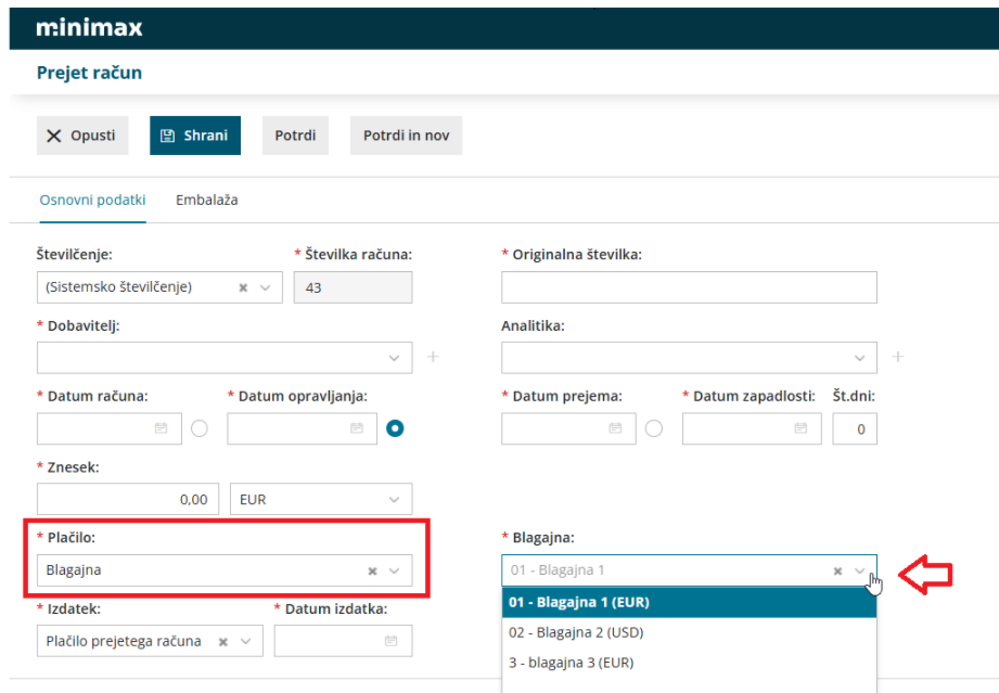 Izbira blagajne pri vnosu prejetega računa