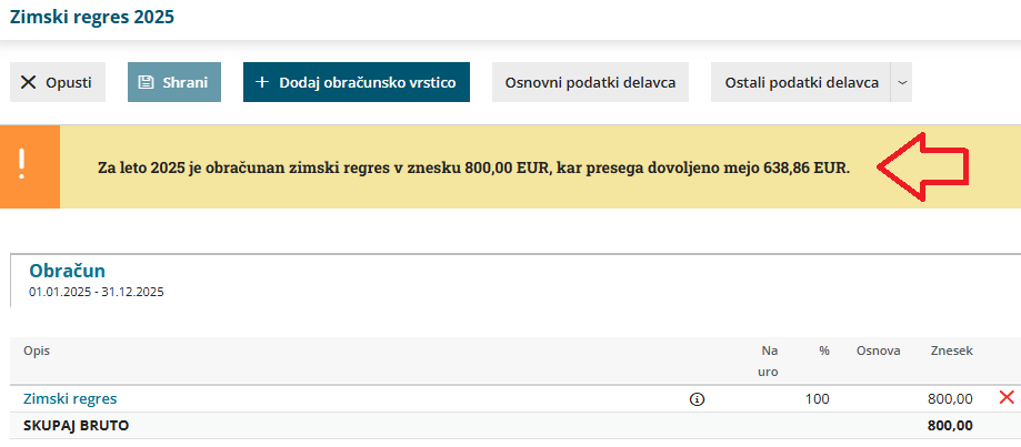- Če vpisani znesek presega zakonsko dovoljeni znesek zimskega regresa, program izpiše opozorilo.