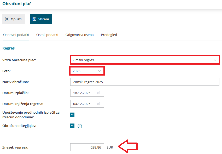 9. V polju Znesek regresa program samodejno predlaga letni znesek zimskega regresa - 638,86 EUR.